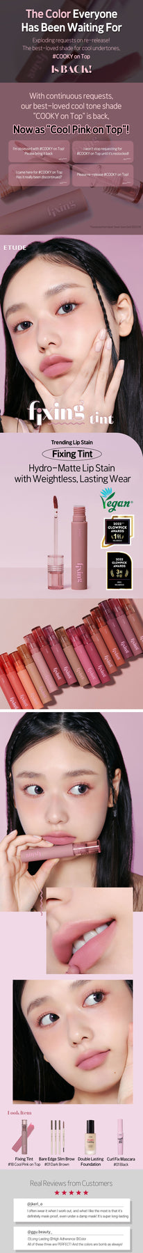 Etude House Fixing Tint offers a matte finish that feels comfortable and non-drying, with a lightweight texture that adheres flawlessly to your lips. The high-moisture matte formula provides a soft and airy sensation, perfect for creating both bold and gradient lip looks. Available in 8 stunning shades!